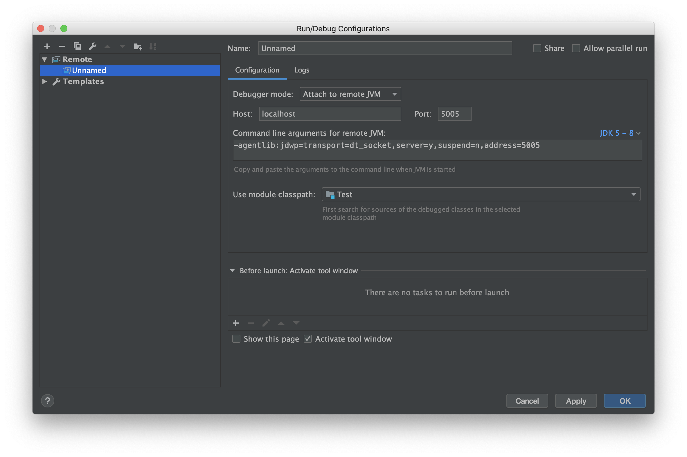 Host 항목에 localhost를 입력하고 Port 정보에 5005를 입력한 다음 "apply" 버튼을 클릭하고, 브레이크 포인트를 설정한 다음 로컬에서처럼 디버깅을 시작하면 된다.