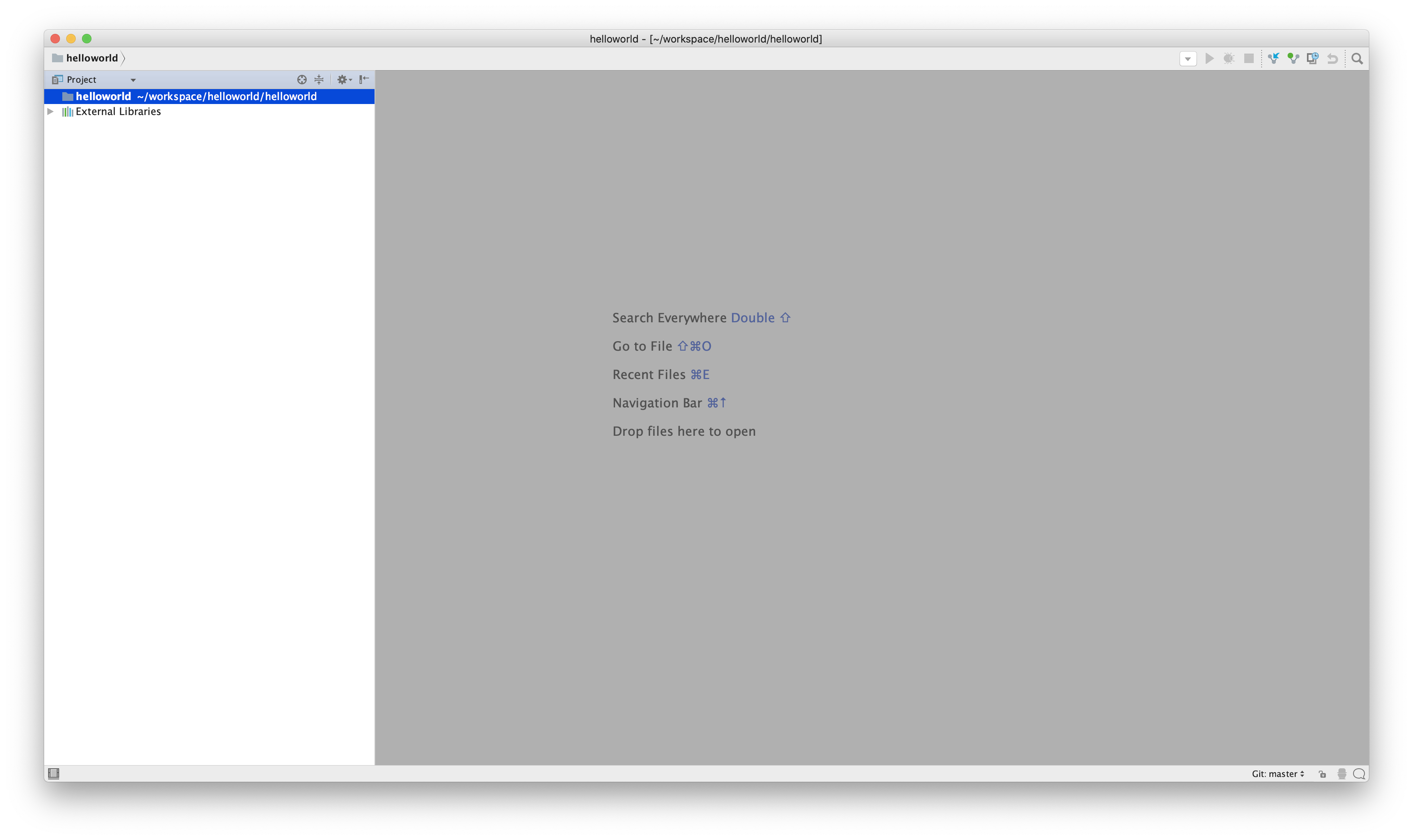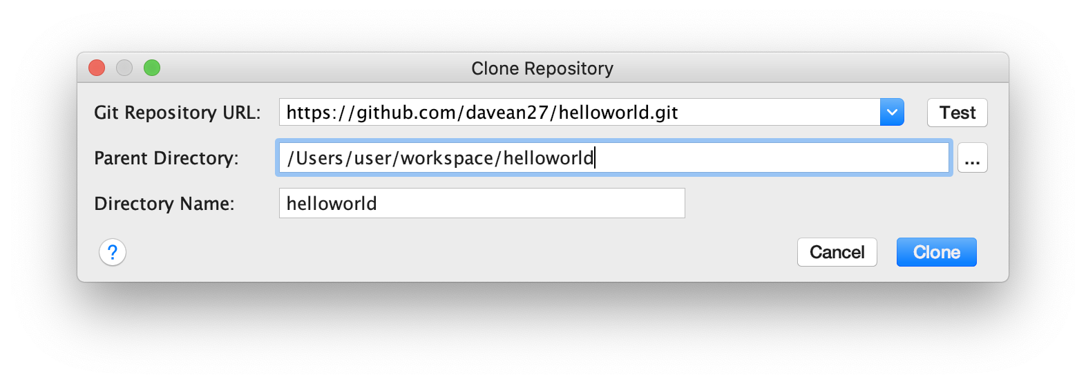 "Git Repository URL" 입력란에 아까 기억해뒀던 깃허브 리파지토리 주소를 입력한다. 그리고 [Clone] 버튼을 입력해서 깃허브 리파지토리를 로컬에 다운로드해서 프로젝트를 만들어준다. 지금은 비어있는 프로젝트지만 공유된 파일이 있다면 그 파일들을 다운로드해서 프로젝트로 만들어준다.