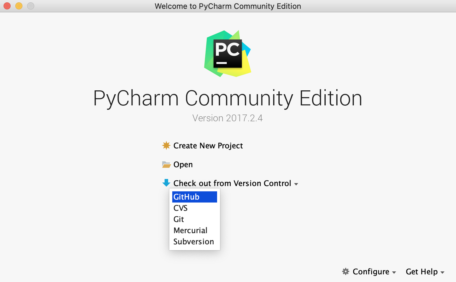 파이참 첫 화면에서 "Check out from Version Control" 버튼을 클릭해서 "GitHub"을 선택하자.
