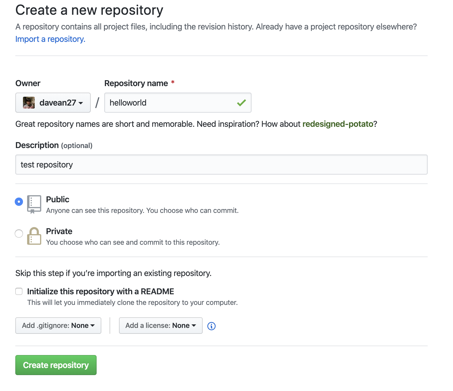 helloworld라는 리파지토리를 만들어봤다. "Create repository" 버튼을 눌러서 리파지토리를 생성하자.