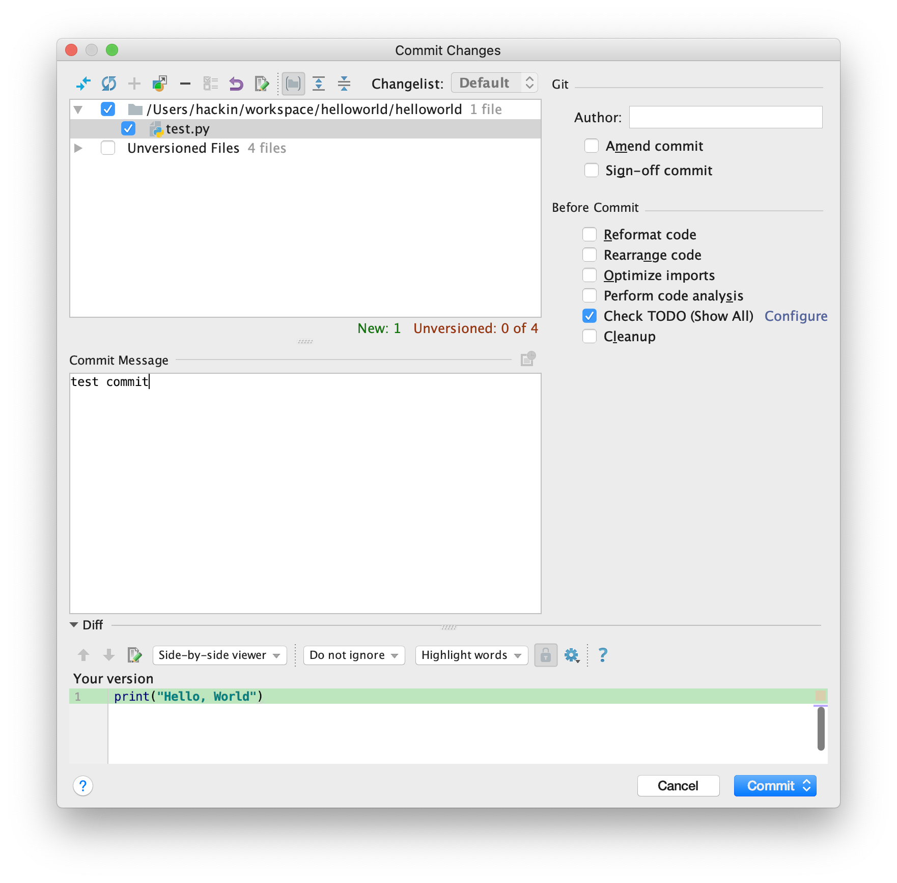 커밋할 파일을 선택하고 커밋 메시지를 입력한 다음, [Commit] 버튼을 눌러 커밋한다. 아직까지 깃허브에 변경사항이 등록된 것은 아니다. 깃허브 리파지토리로 Push를 해야한다.