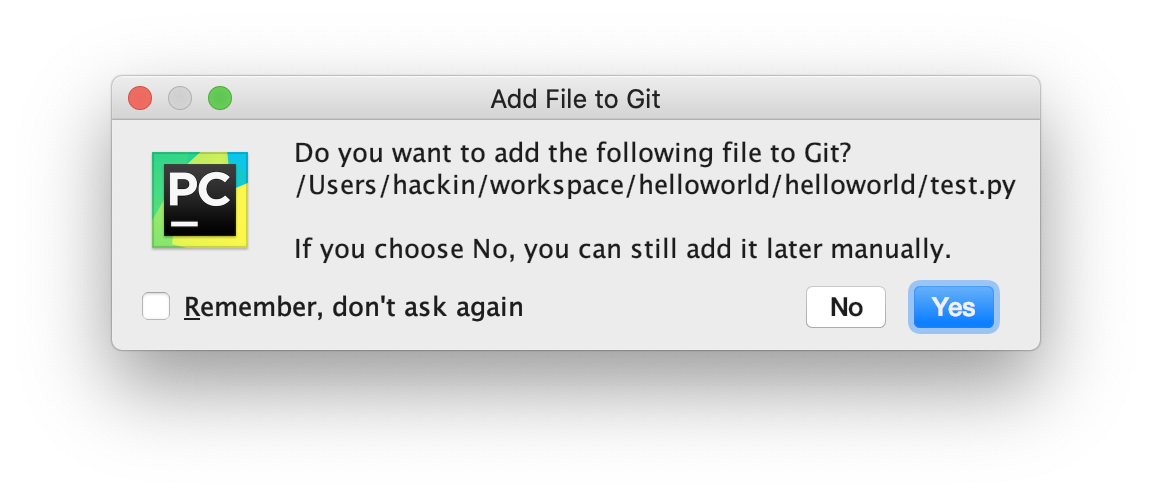 깃에 파일을 추가할 것인지 파이참이 물어본다. [Yes] 버튼을 눌러서 깃에 추가한다.