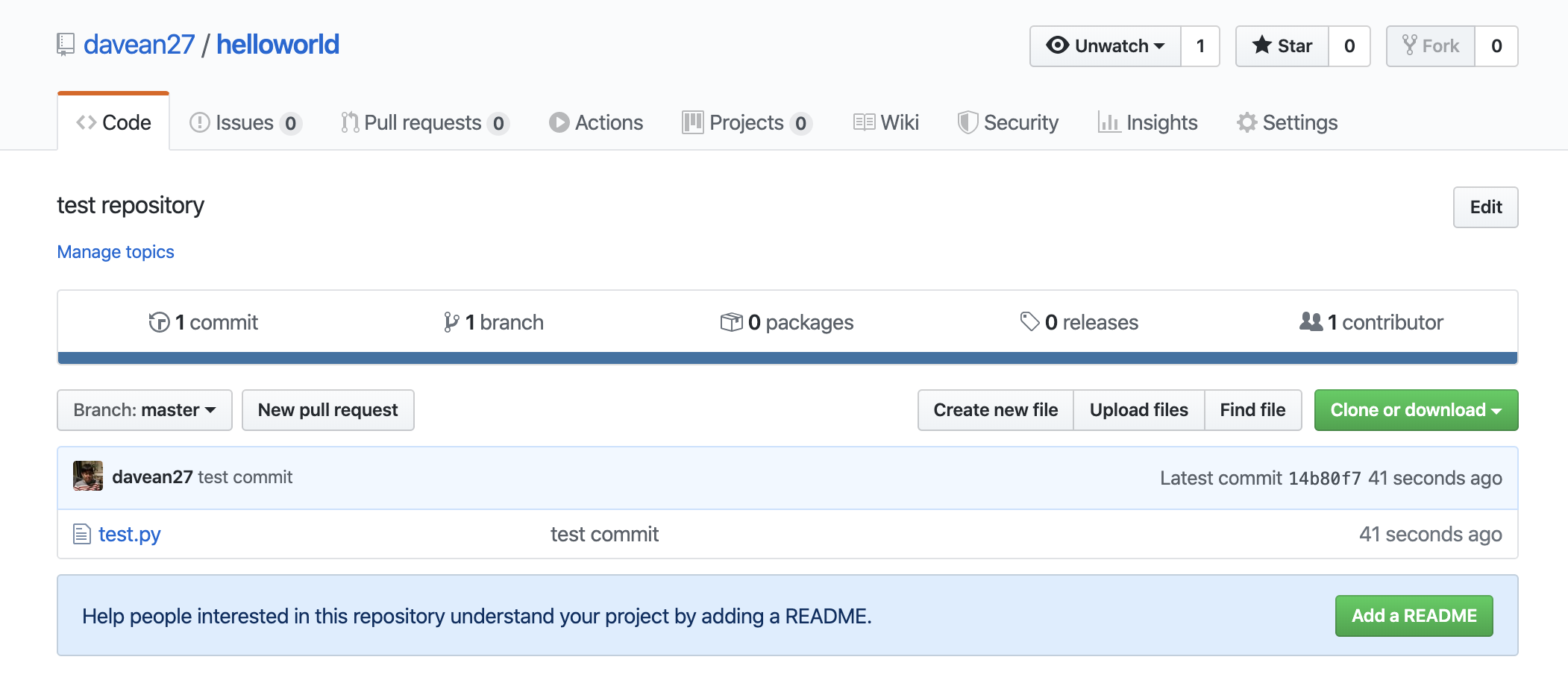 helloworld라는 리파지토리를 만들어봤다. "Create repository" 버튼을 눌러서 리파지토리를 생성하자.