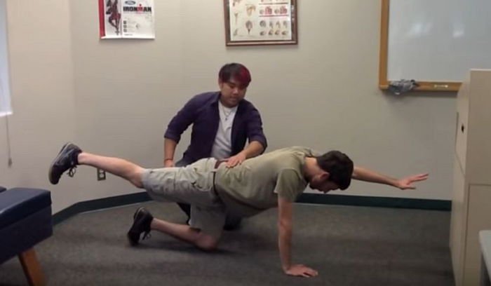 이 상태에서 오른쪽 다리와 왼쪽 팔을 들어 올린 상태에서 10초간 버틴다. 이후 팔과 다리를 바꿔서 10초간 버틴다. 이를 총 10회씩 3세트 반복한다.