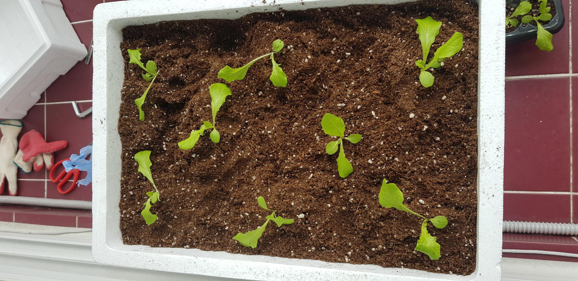 웃자란 상추모들을 모판에서 픽픽 쓰러지도록 놔둘 수 없어서 화분에 옮겨 심기로 했습니다. 화분이라고 했지만 진짜 화분은 아니고 택배를 품고온 스티로폼 박스를 화분으로 만들어 쓰기로 했습니다.