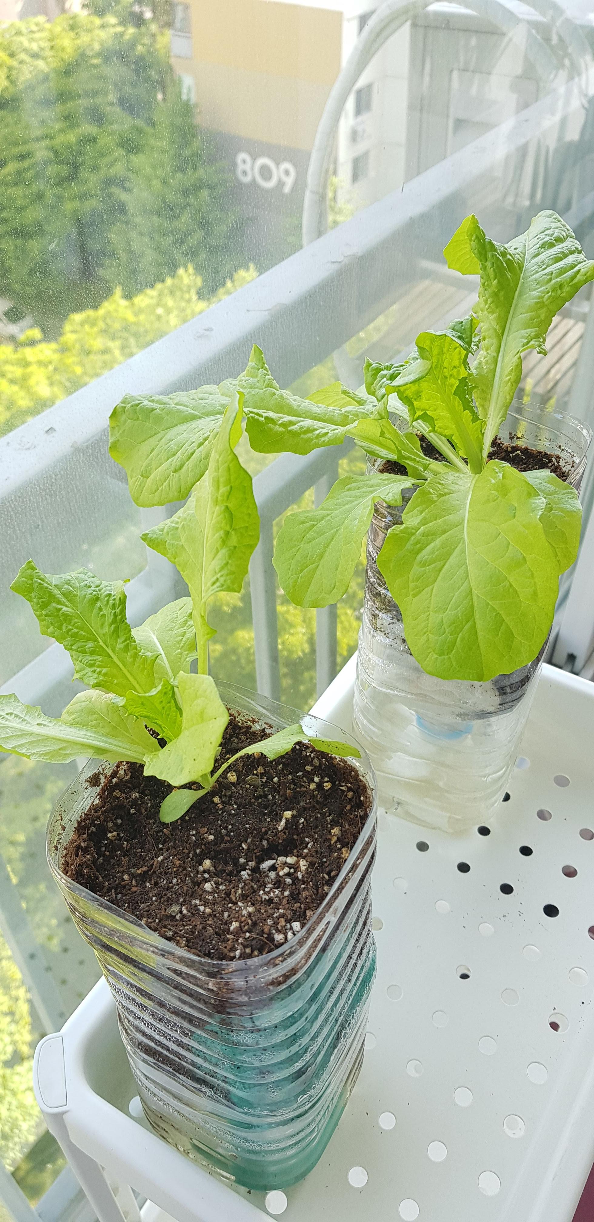 그 사이 남은 상추모를 심기 위해 페트병을 모았고, 페트병으로 화분을 만들어서 옮겨 심었습니다. 맨 오른쪽에는 치킨무 통에다가 심어봤는데 깊이가 깊지 않아서 그런지 자라는 속도가 시원치 않았고, 결국 페트병에다가 다시 옮겨 심었습니다.