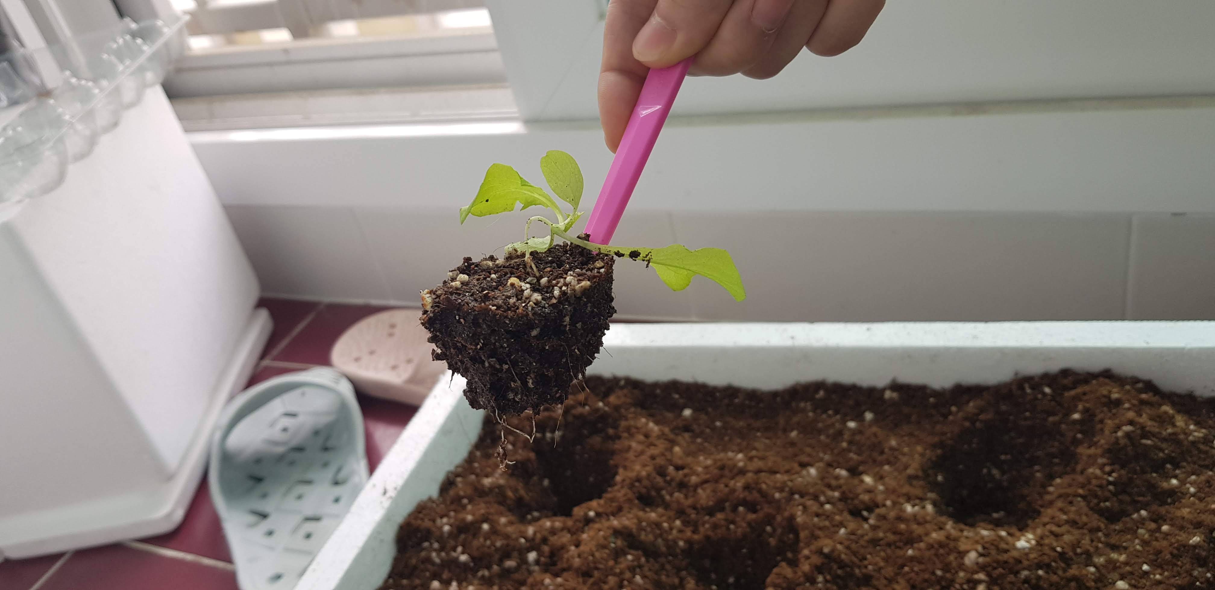 트레이에 상토를 이용해서 생육환경을 조성해주고, 구멍을 하나 파서 상추씨 3립을 넣고 되도록 얕게 흙을 덮어줍니다. 상추씨를 파종하고, 물을 듬뿍줍니다.