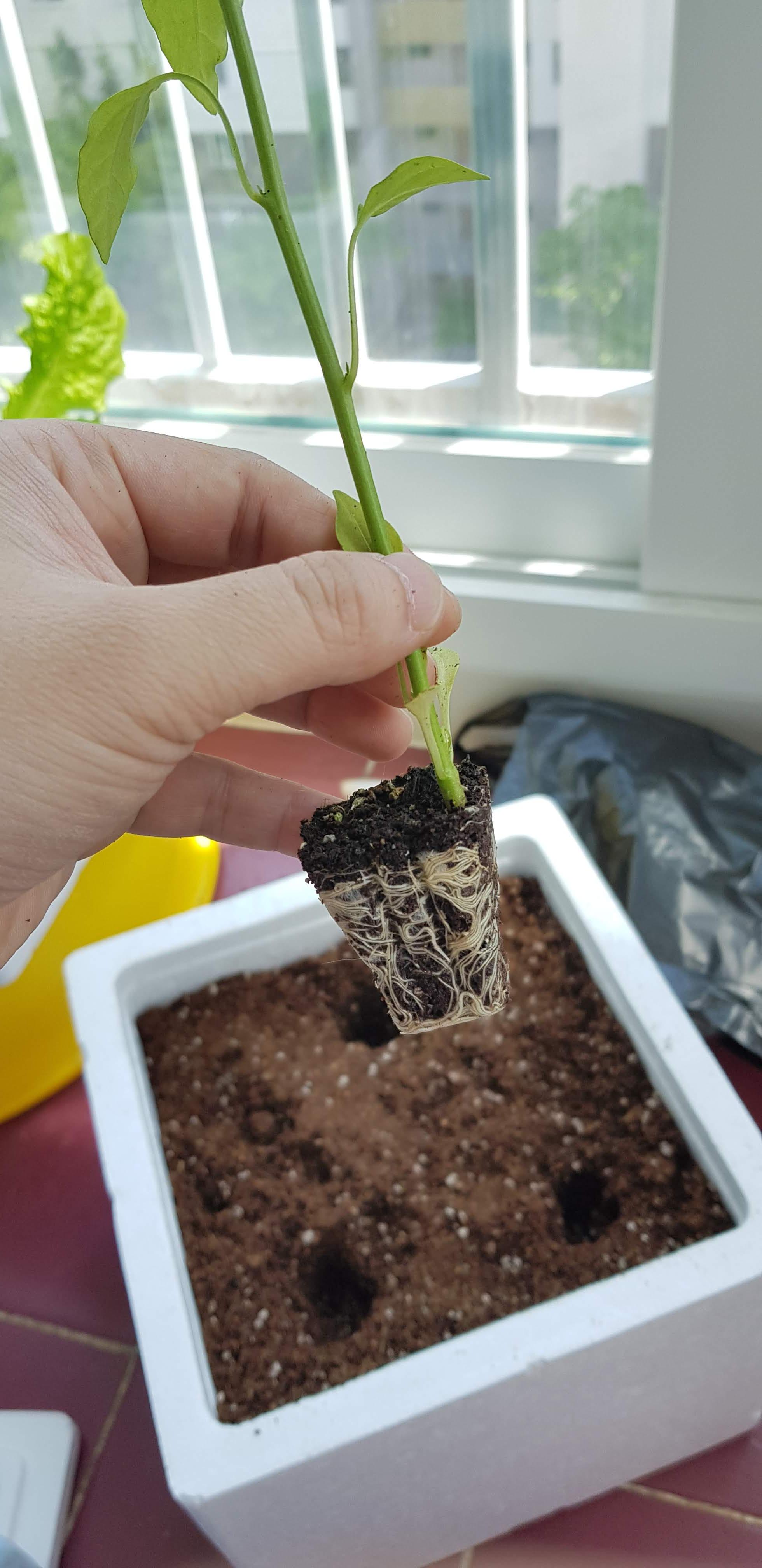 뿌리가 상하지 않게 뿌리를 살짝 털어줍니다. 살짝 뿌리를 흩어줘서 고추의 뿌리가 상토로 쑥쑥 뻗어 나갈 수 있게 해줍니다.