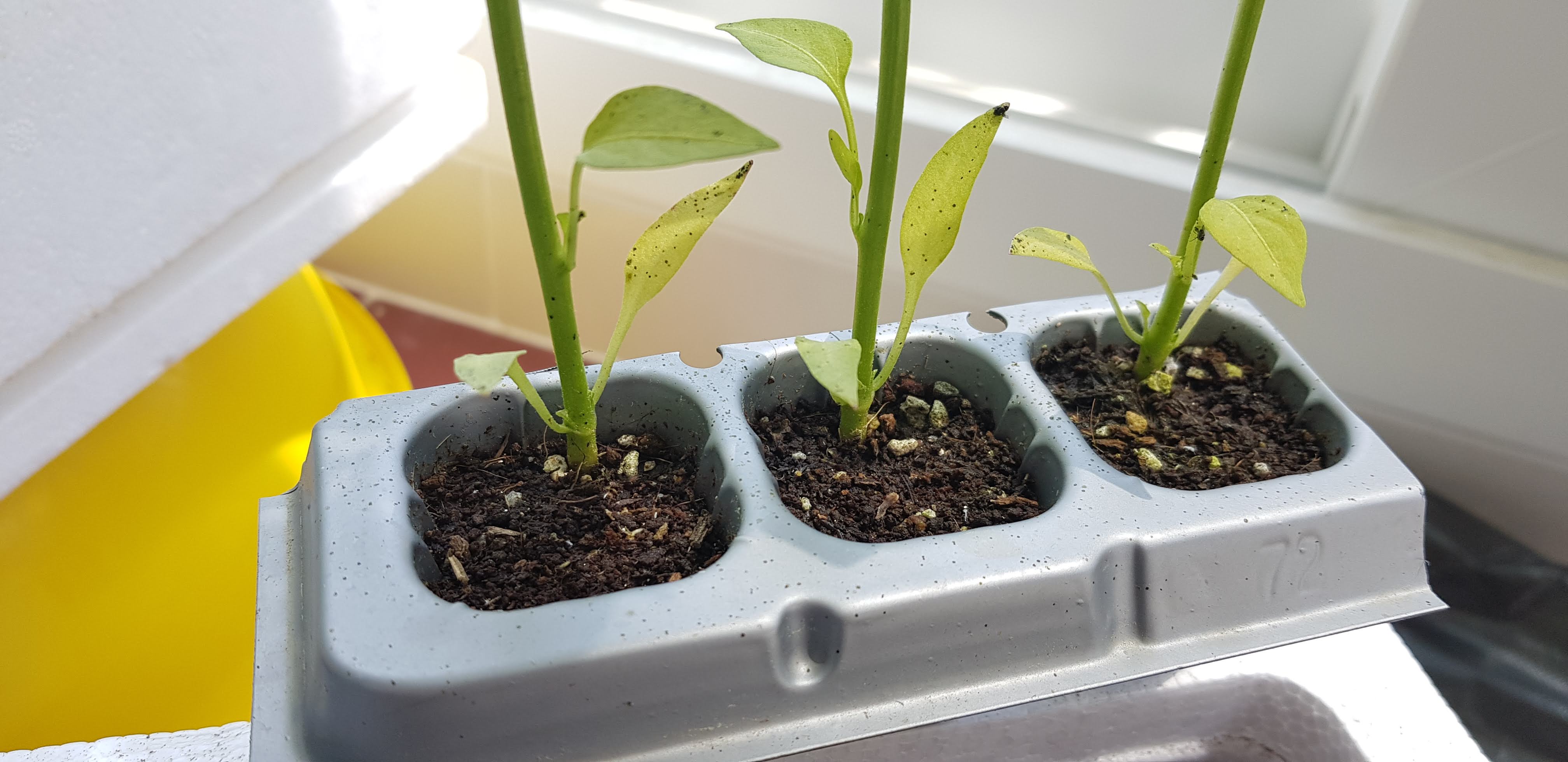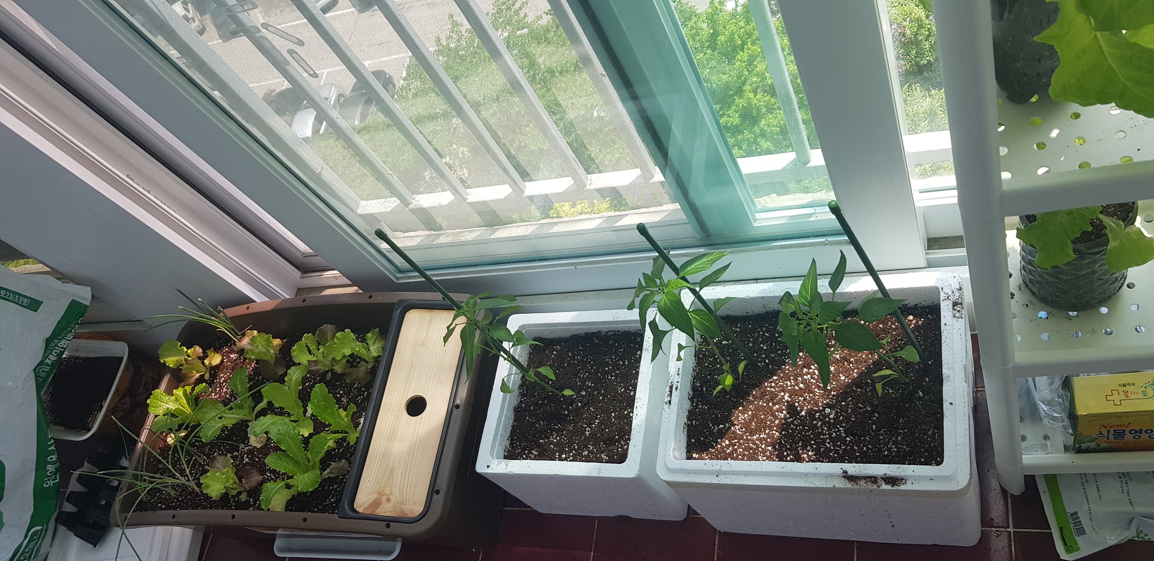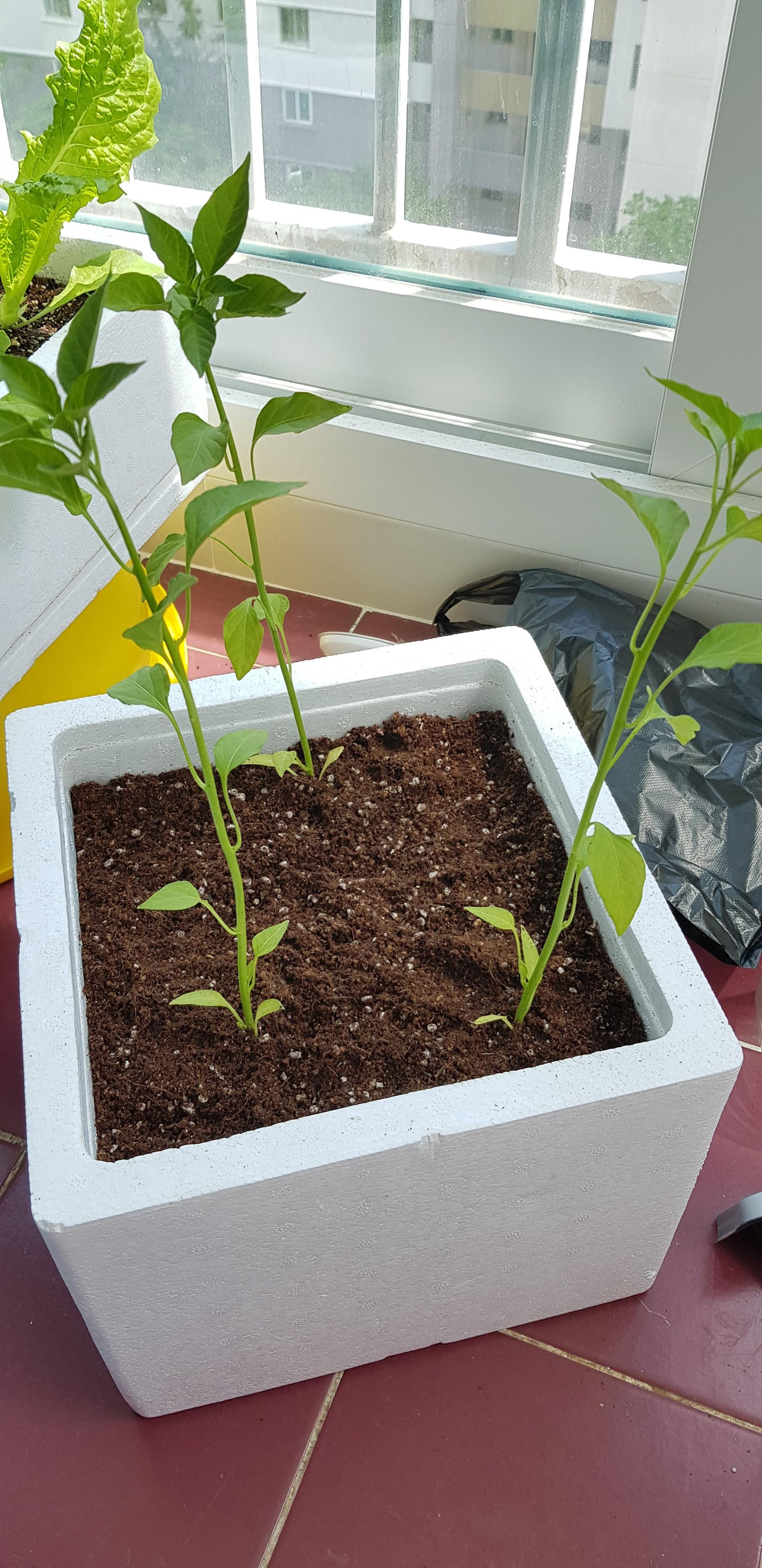 농수산물 시장에서 청양고추 모종을 사와서 스티로폼 화분에 옮겨 심었습니다. 원래는 씨앗을 발아시켜서 직접 고추모를 만든 후에 정식하려고 했지만 씨앗을 발아시킬 타이밍을 놓쳐서 고추모를 구입하게 되었습니다.