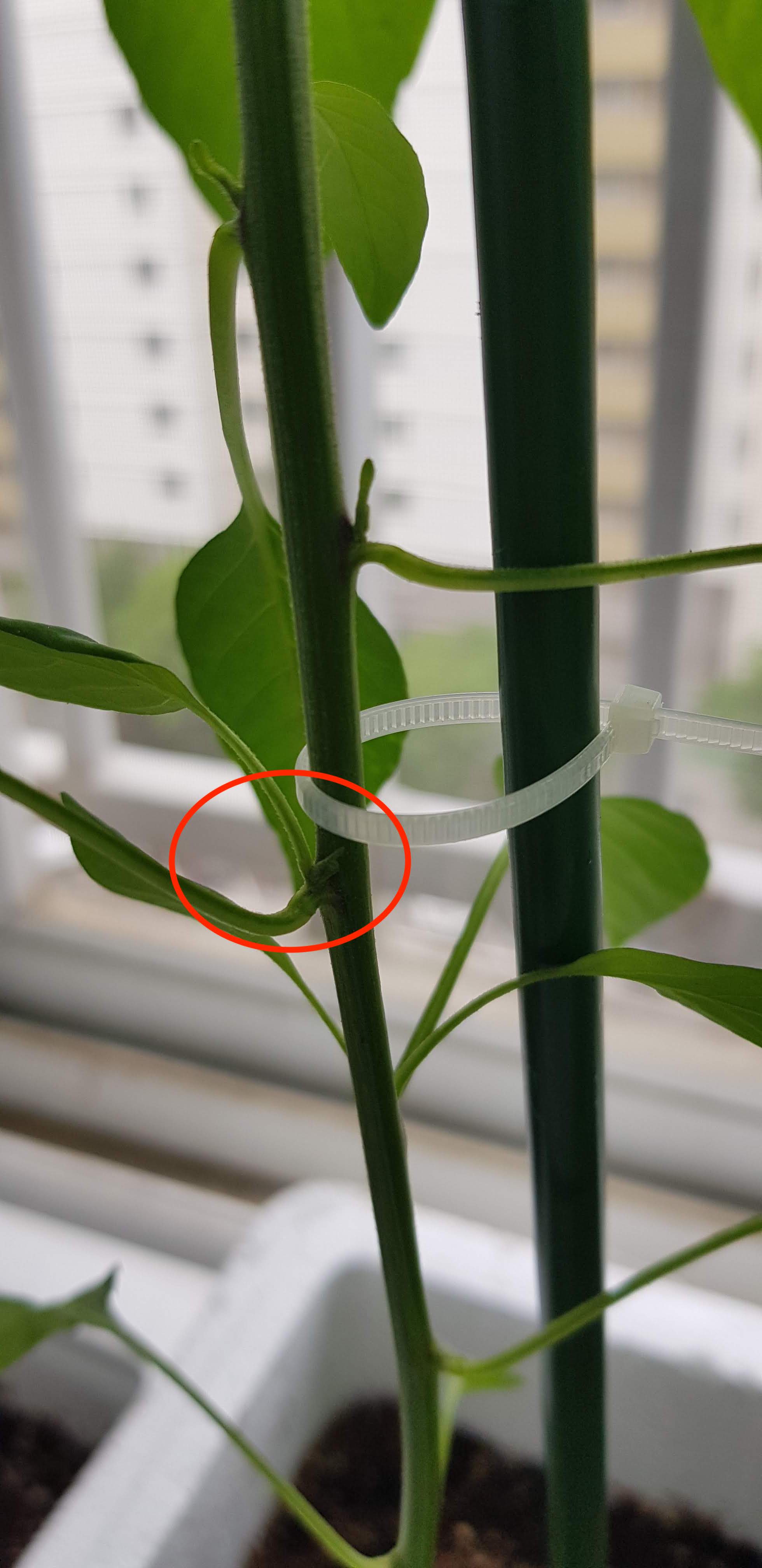 비슷한 원리로 방아다리 아랫쪽에 있는 곁순들도 제거해주셔야합니다. 날씨가 더워지면서 고추 모의 본잎과 줄기 사이에서 자꾸 곁순들이 자라나는 것을 볼 수 있습니다.