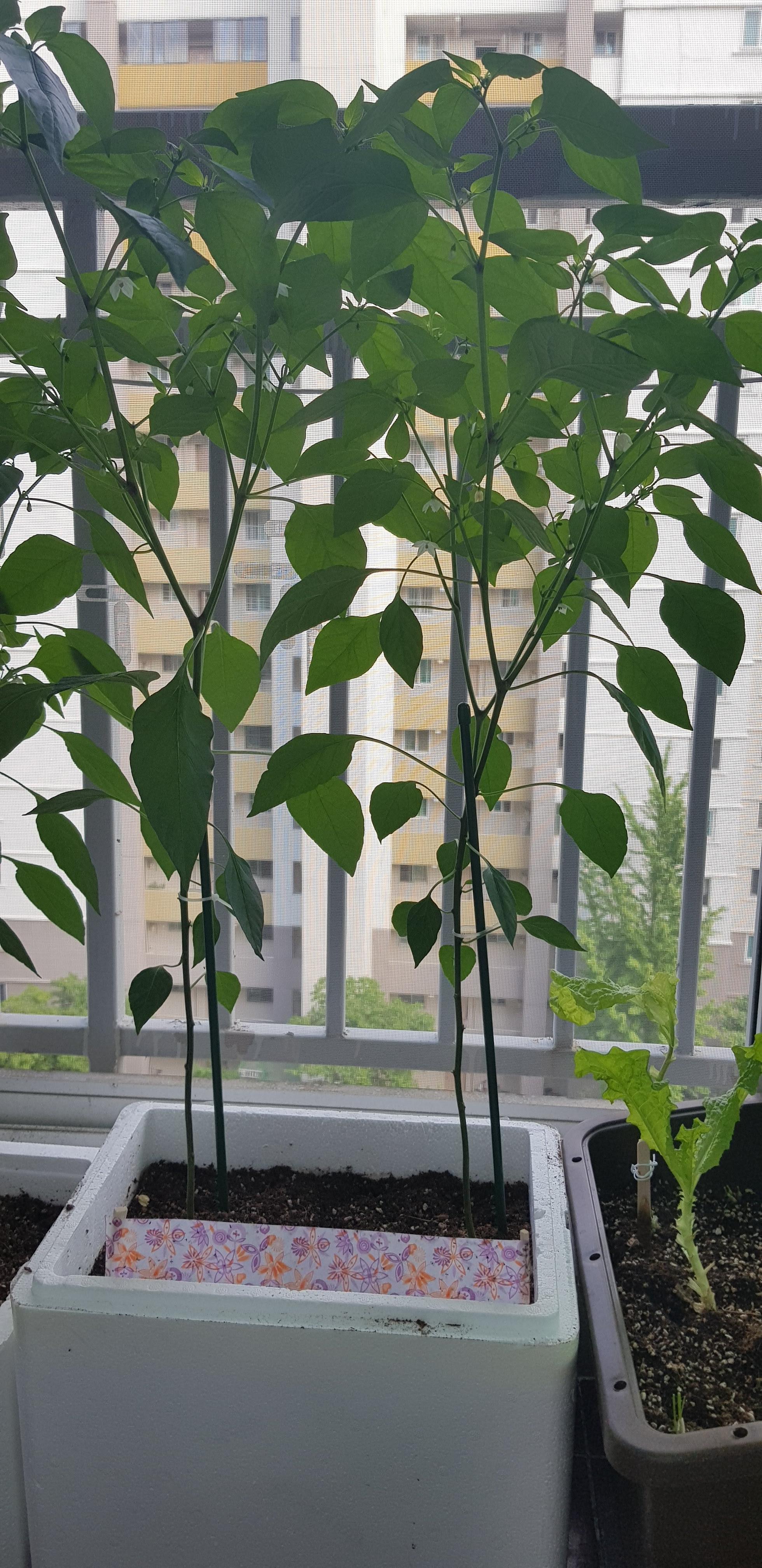 2021년 처음으로 시작했던 베란다 회분에서 상추와 고추, 대파가 무럭무럭 자라고 있습니다. 처음 심었던 상추와 대파는 자라나는 속도를 먹는 속도가 따라가지 못 할 정도로 자라고 있습니다. 성공적인 상추 농사에 이어서 좀 더 난이도가 높은 작물인 고추농사를 지어보고자 5월 5일 어린이날에 고추모를 옮겨 심었습니다.