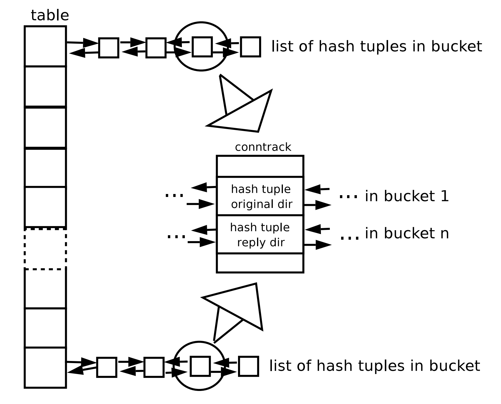 해시 테이블의 각 해시버킷에 커넥션 트래킹 정보를 기록하는 노드가 이중 연결리스트로 구성이 되어 있다. 위 그림을 참고하면 nf_conntrack 모듈의 구조를 알 수 있다.(출처 : http://people.netfilter.org/pablo/docs/login.pdf) 이 해시 테이블에 영향을 주는 파라미터로는 해시테이블의 버킷 개수를 지정하는 'nf_conntrack_buckets'과 해시테이블에 저장되는 노드의 최대 개수를 지정하는 'nf_conntrack_max'가 있다.