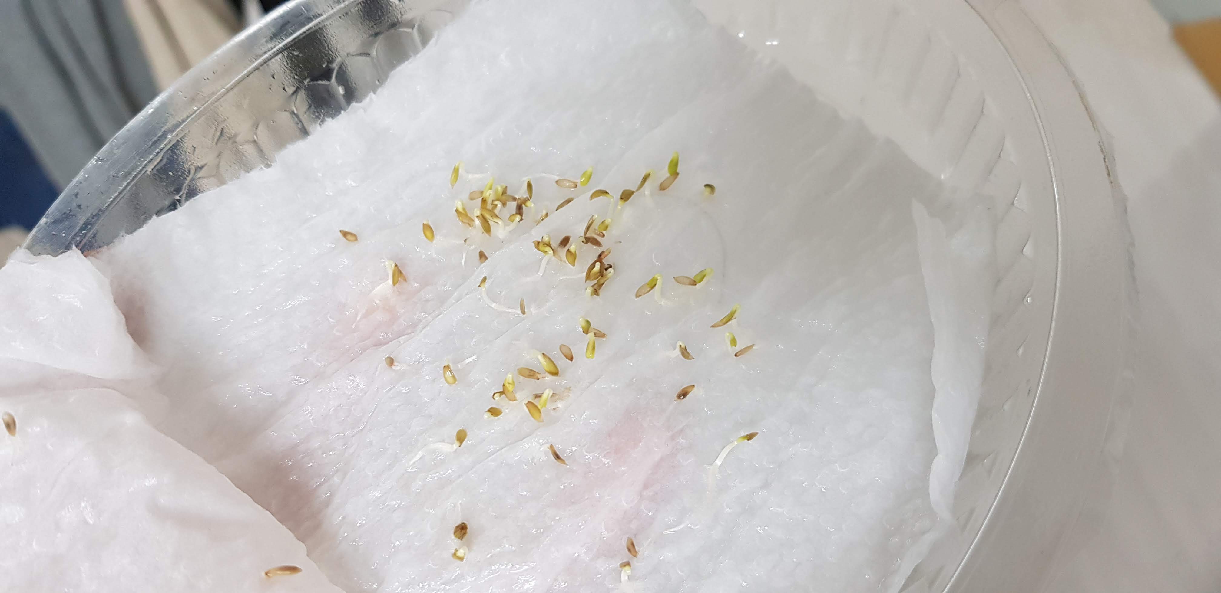 플라스틱 통에다가 키친타월을 깔아두고 상추 씨앗을 흩뿌려놓습니다. 그리고 물을 충분히 뿌려 키친타월이 젖을 수 있도록 해준다음 키친타월을 한번 더 덮습니다. 그리고 뚜껑을 덮고, 수건으로 감싸서 보관해뒀습니다. 빛을 차단하고 과도한 수분 증발을 막으며, 보온을 해주기 위함이었습니다.