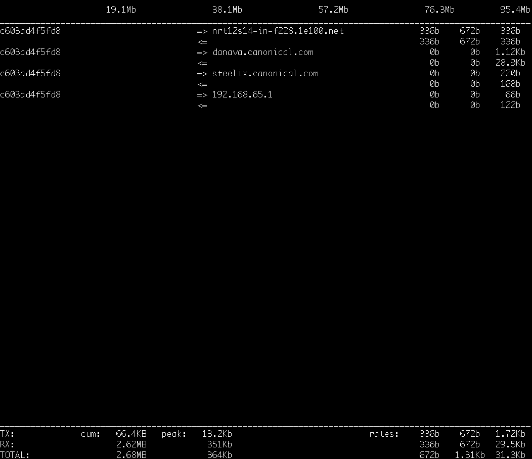 각 라인의 첫 번째 항목은 현재 접속중인 머신의 호스트 네임 혹은 IP 주소를 의미한다. 위 사진에서 'c603ad4f5fd8'라는 정보로 표시되고 있는 것이 현재 접속중인 머신의 호스트 정보다. (테스트를 위해 도커 컨테이너를 띄워서 iftop 툴을 설치해 사용했기 때문에 컨테이너의 id가 호스트 정보에 표시되고 있다.)